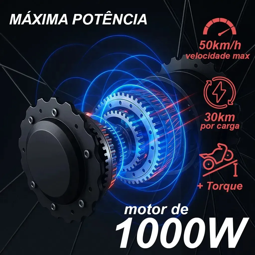 O grande diferencial da V8 está no seu motor de 1000W de potência máxima. Diferente de modelos convencionais de entrada, esta e-bike foi projetada para quem não quer perder tempo em subidas ou no fluxo do trânsito.