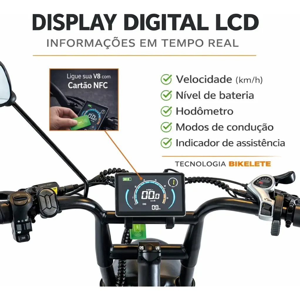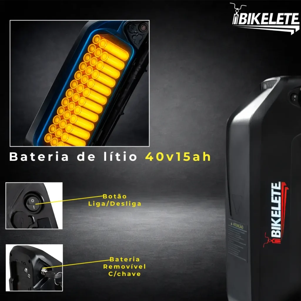 Para suportar toda essa potência, a Bikelete equipou a V8 com uma bateria de lítio de alta durabilidade. O uso do lítio em vez de chumbo garante uma e-bike muito mais leve, com carregamento mais rápido e maior vida útil das células, ideal para quem precisa de autonomia no dia a dia.